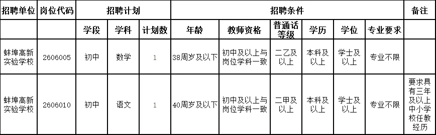 2026年度蚌埠高新区中小学教师(事业编制)公开招聘已经开始了。蚌埠高新实验学校今年计划招聘两名教师,详情请参看下表: